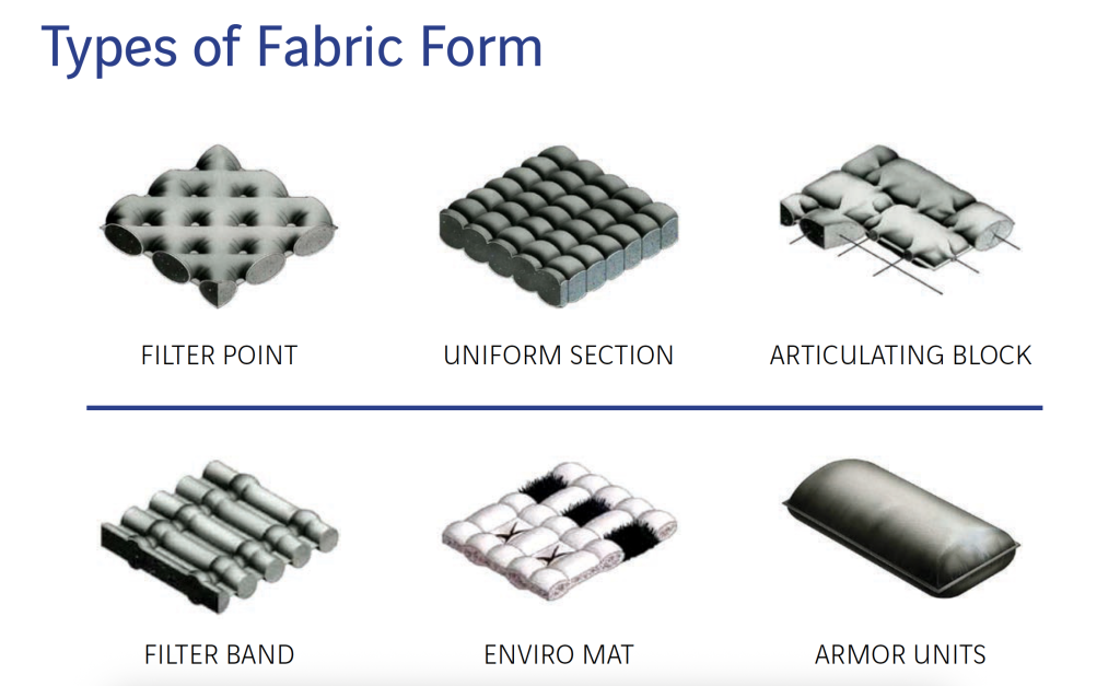 Fabric forms adalah sistem cetakan geotekstil yang diisi beton atau grout untuk membentuk lapisan pelindung yang kuat namun tetap adaptif. Salah satu contohnya adalah flexible concrete mattress atau kasur beton fleksibel. Sistem ini menggabungkan kekuatan beton dengan fleksibilitas tekstil berteknologi tinggi.